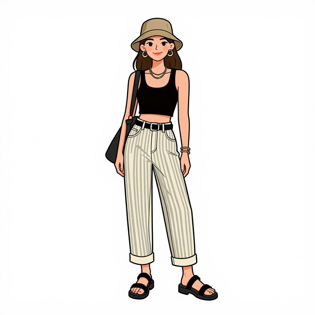 This is a digital drawing in a cartoon style featuring a young woman with light brown skin and shoulder-length dark brown hair. She is smiling with large, expressive eyes and wearing small hoop earrings. She is dressed in a sleeveless black top with white overalls that have a front pocket and are cuffed at the ankles. She is also wearing black open-toed sandals. Her right hand is in her pocket, and her left arm hangs naturally by her side. The background is plain white, emphasizing her colorful outfit and cheerful demeanor. The overall style is clean and vibrant, with bold outlines and flat colors.