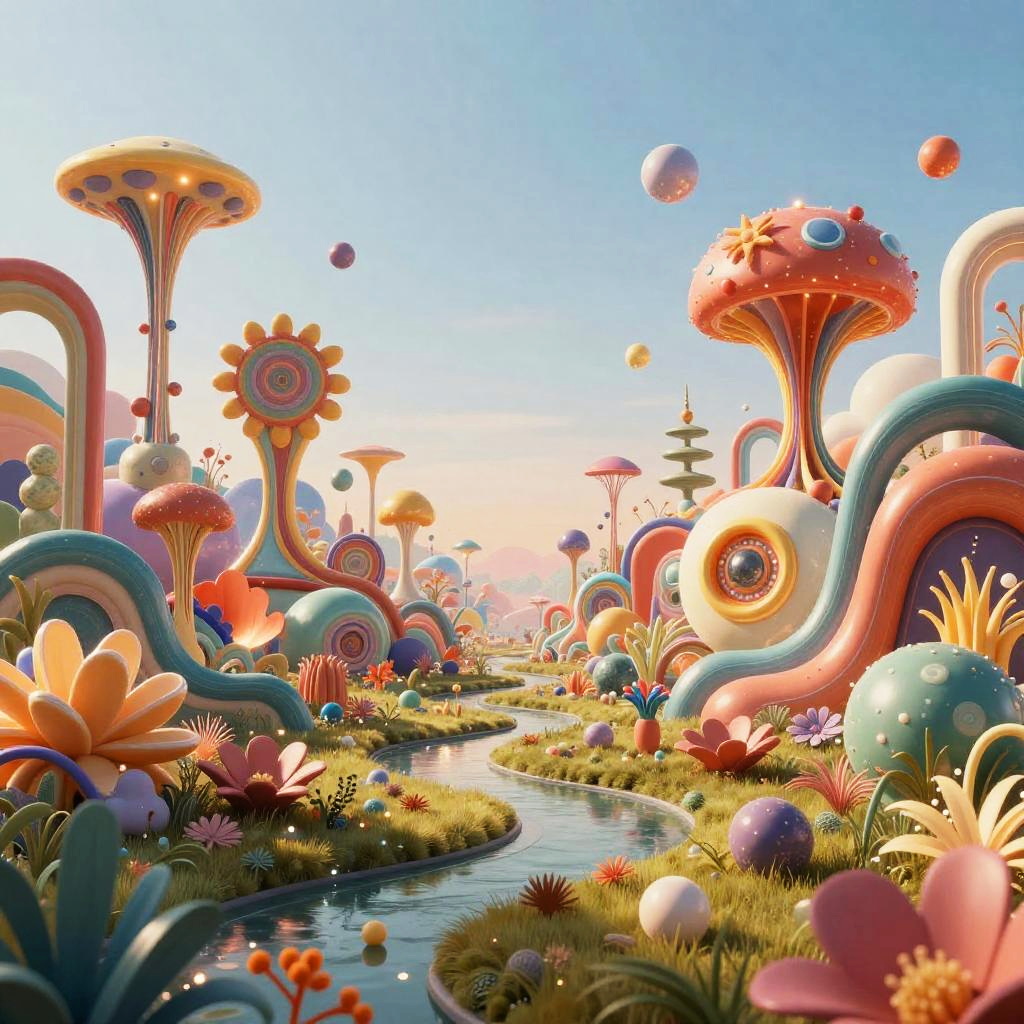 This digital art piece features a surreal, vibrant landscape with a winding blue river flowing through a colorful, wavy terrain. Tall, multi-colored buildings with spires and domes dot the background, surrounded by fluffy, rainbow-striped clouds. Star-like blue and white lights form a constellation in the night sky, with a luminous, snake-like trail descending. The foreground showcases whimsical plants, flowers, and small, glowing orbs. The scene is illuminated by soft, ambient light, creating a dreamy, fantastical atmosphere. The overall style is highly detailed and vibrant, reminiscent of modern digital surrealism.