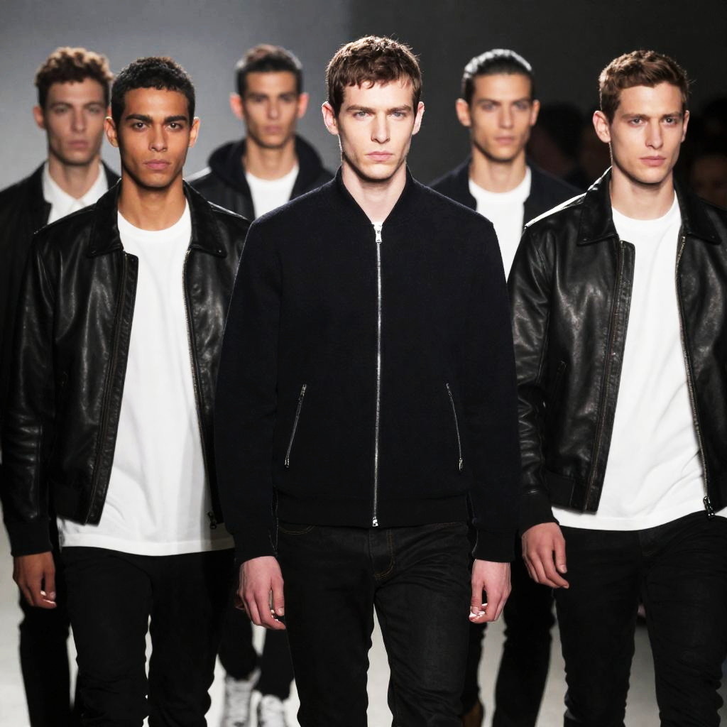 Photograph of a fashion runway show. Six men walk in a line, wearing leather jackets, hoodies, and white t-shirts. Center man in black zip-up jacket. Background is dimly lit with a foggy effect. Intense facial expressions.