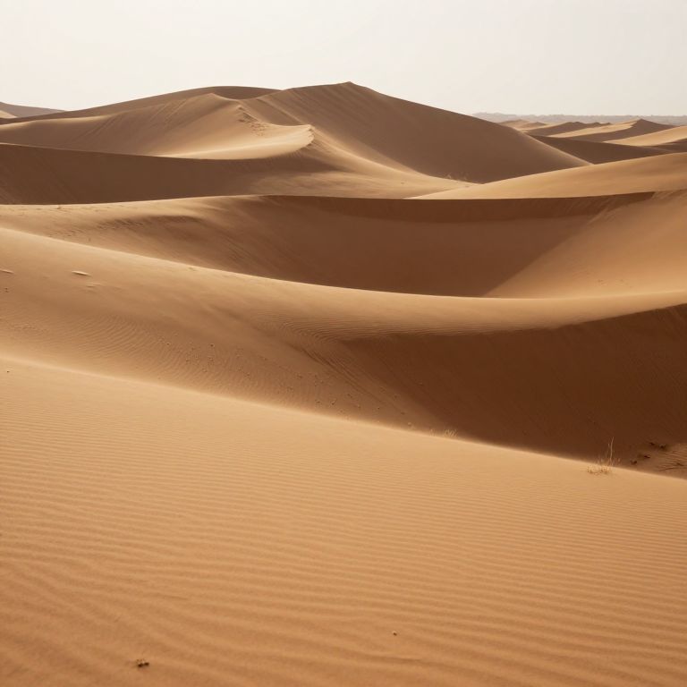 Photograph of a vast desert landscape featuring rolling sand dunes under a bright, white sky. The sand dunes have a rich, golden-brown hue and are adorned with gentle, rippled textures from the wind. The sunlight casts soft shadows, highlighting the dunes' undulating forms. The image captures the serene, untouched beauty of the desert, with no visible vegetation or human presence, emphasizing the natural, wave-like patterns in the sand. The overall atmosphere is calm and expansive, with the warm colors of the sand contrasting against the stark white sky.