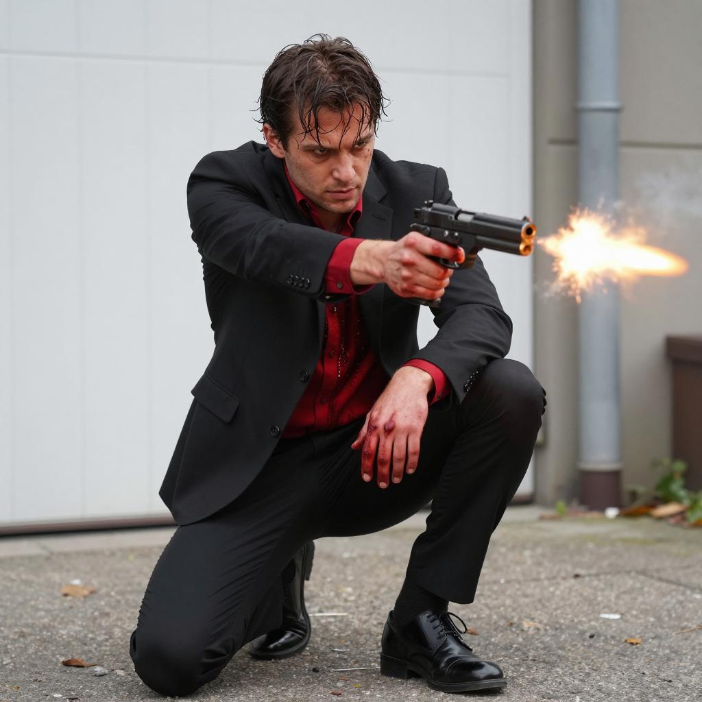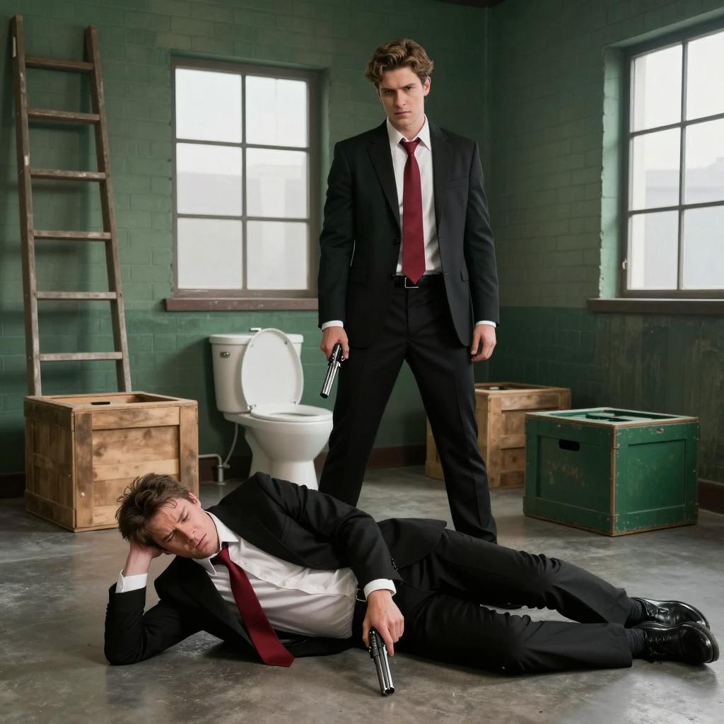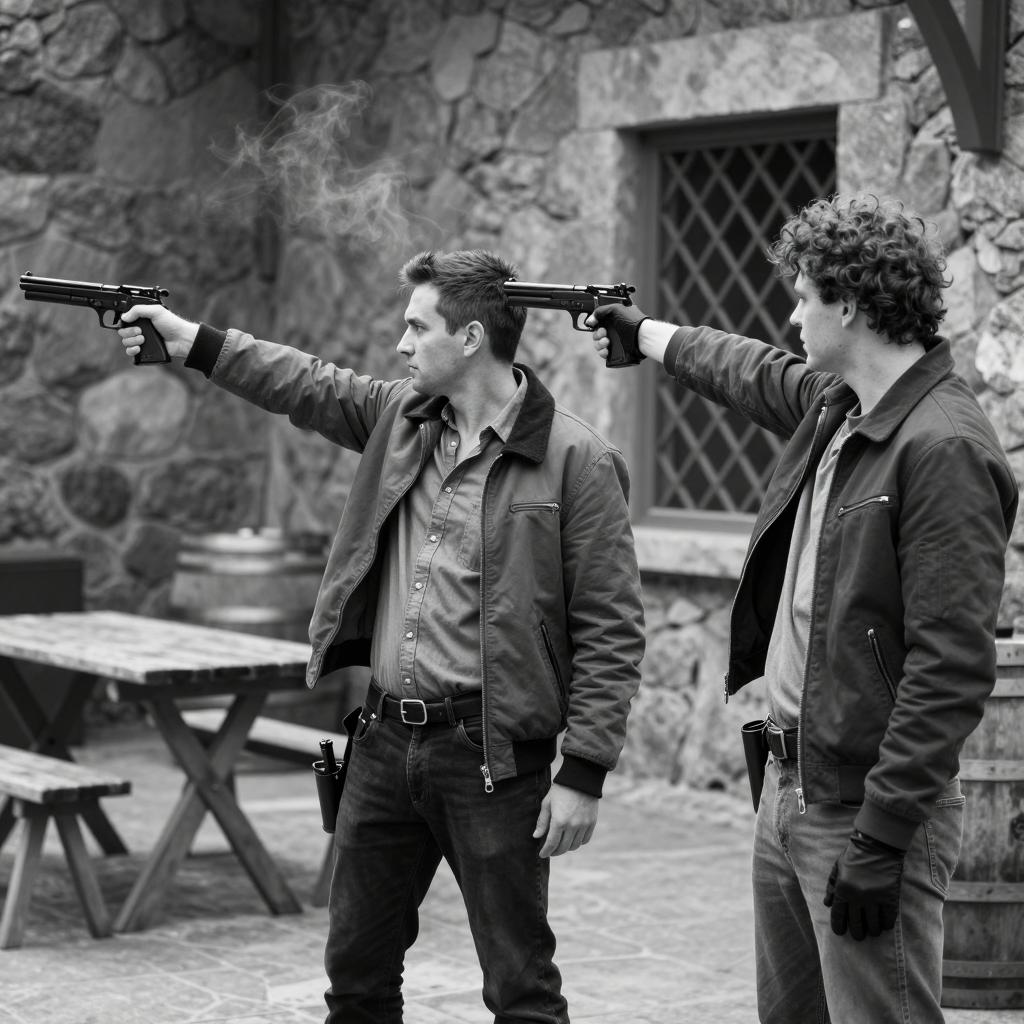 Black and white photo of two men in an outdoor stone setting. Both are pointing guns. The man on the left has short, dark hair, wearing an open jacket and shirt, aiming left. The man on the right has curly hair, wearing a jacket and gloves, aiming right. Background includes a wooden table, barrel, and diamond-patterned window. Smoke is visible.