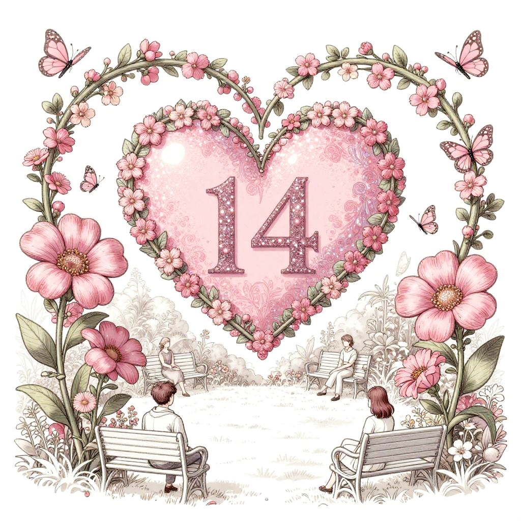 Magical 14th of February garden filled with giant heart-shaped flowers and glittering pink vines, with butterflies flitting around and couples sitting on benches, in a expressionist, romantic and enchanted setting