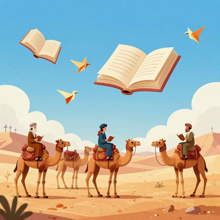 Digital illustration of four men in traditional attire riding camels in a desert, with floating open books and birds against a bright blue sky.