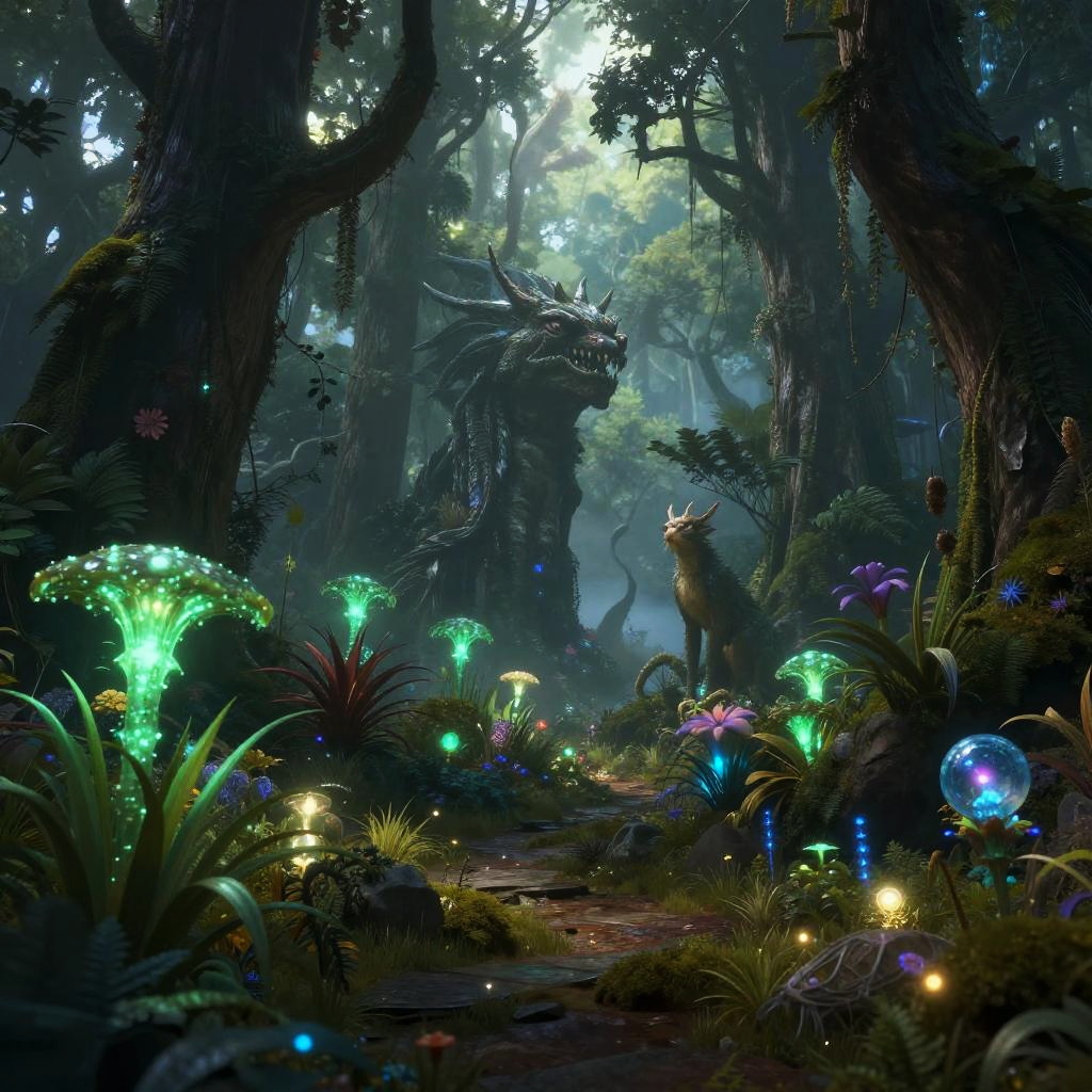 Enhanced visuals of a mythical forest with glowing flora, bioluminescent plants illuminating the dark, misty atmosphere, enchanted creatures, hyper-realistic textures and colors.
