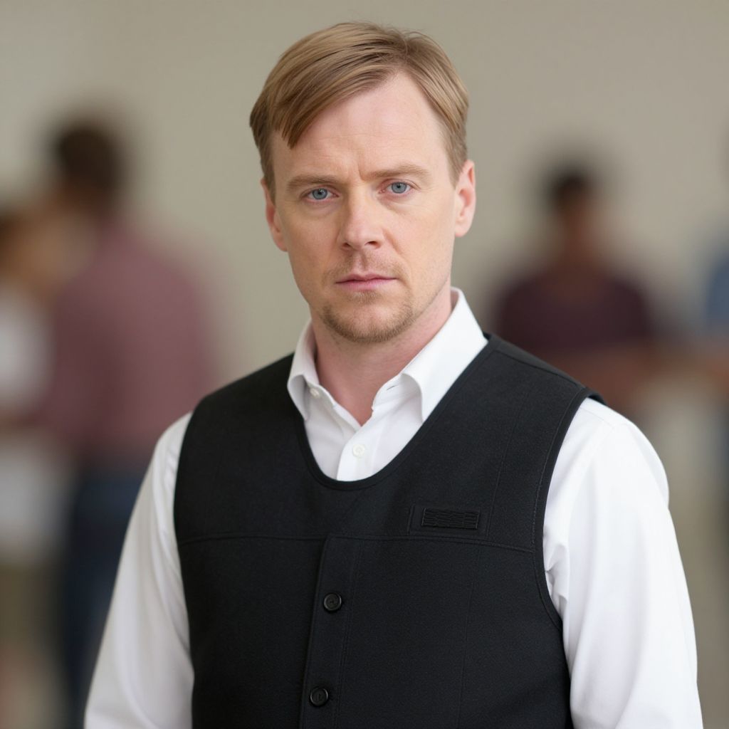 Walter white costume, male focus, 1boy, blonde hair, solo, looking at viewer, vest, blurry, shirt, bulletproof vest, blue eyes, blurry background, white shirt, realistic, child, short hair