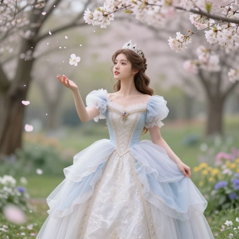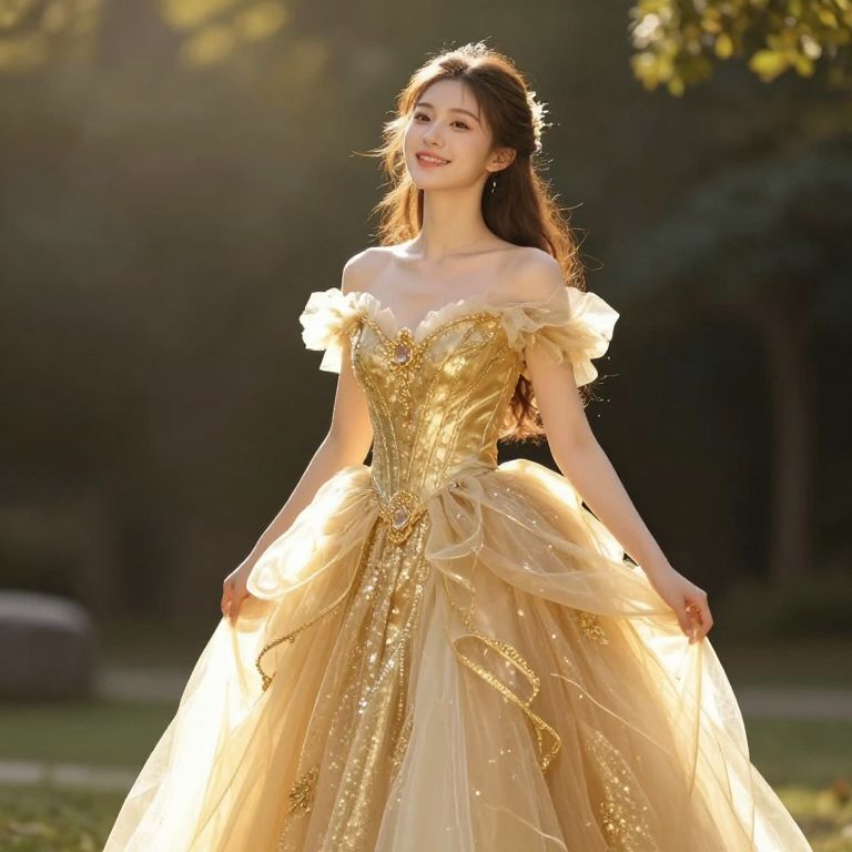 Radiant in a golden gown, the embodiment of hope and transformation stands poised, her smile echoing the warmth of a fairy tale come alive, where dreams intertwine with reality.