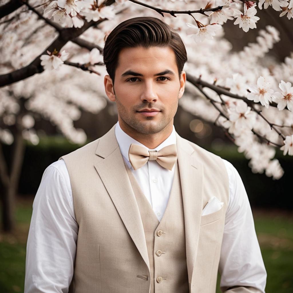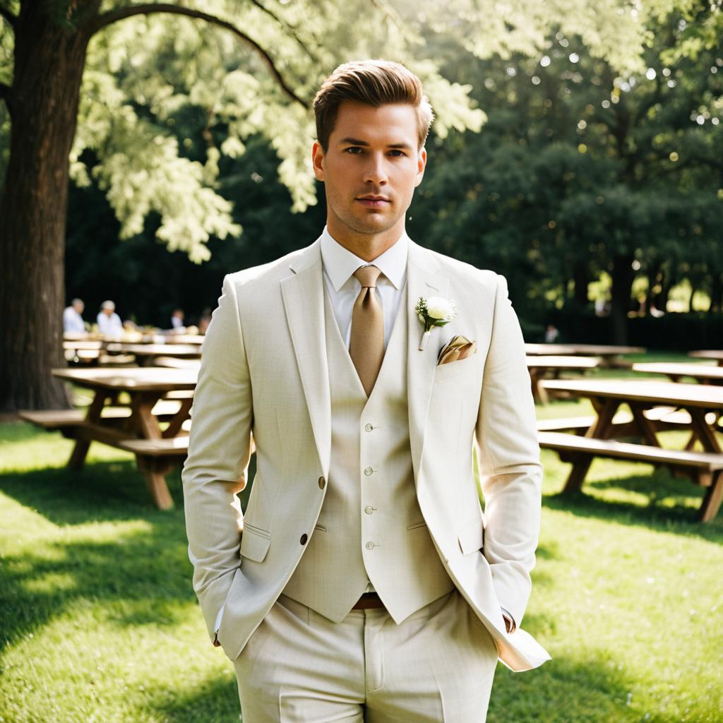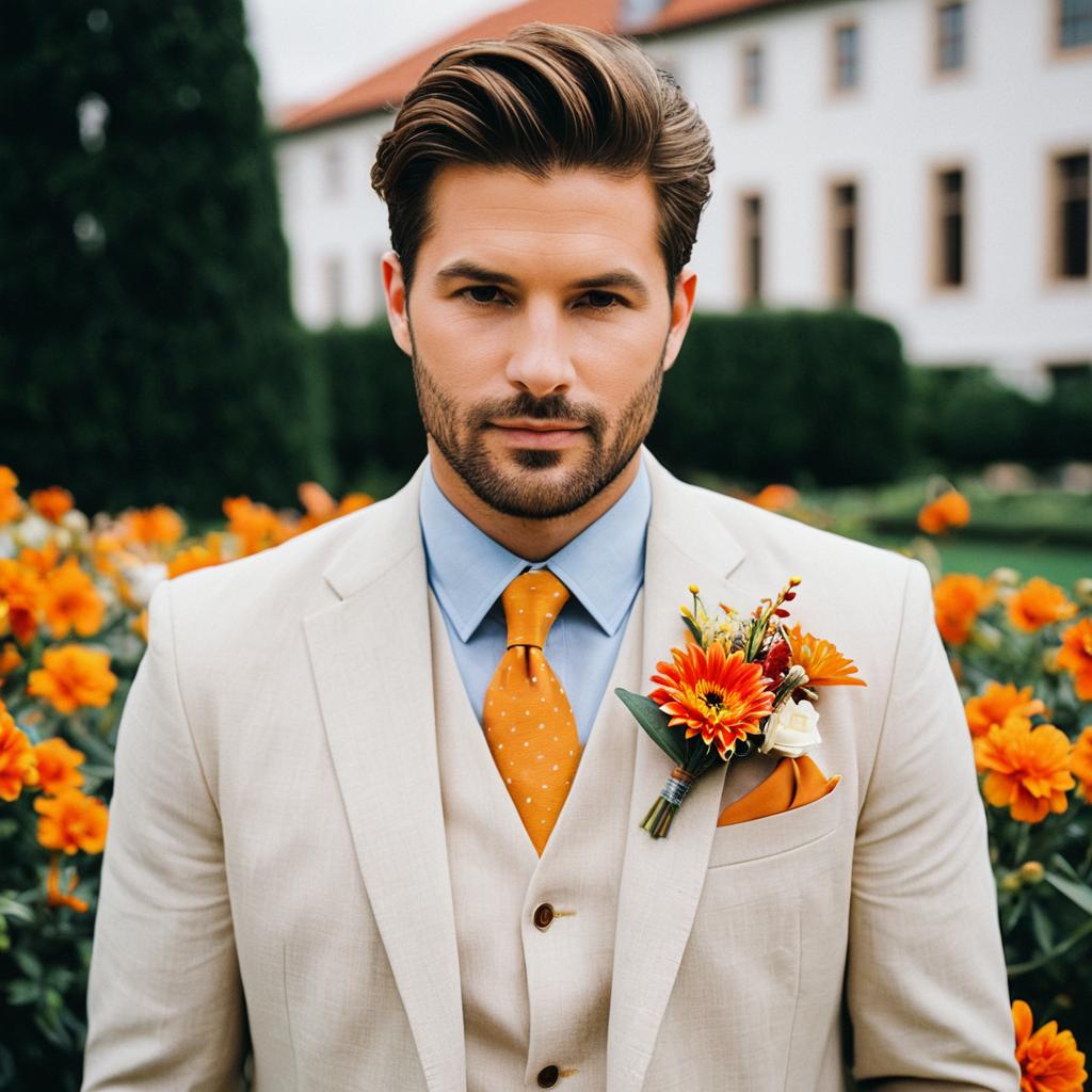 Portrait of a handsome fair-skinned man with brown styled hair and blue eyes, wearing a beige suit jacket with a matching vest, light blue dress shirt, and an orange polka dot tie. He has a colorful floral boutonniere with orange, red, and yellow flowers pinned on the left lapel. The background features a garden with vibrant orange flowers and blurred European-style architecture, captured in soft natural light.