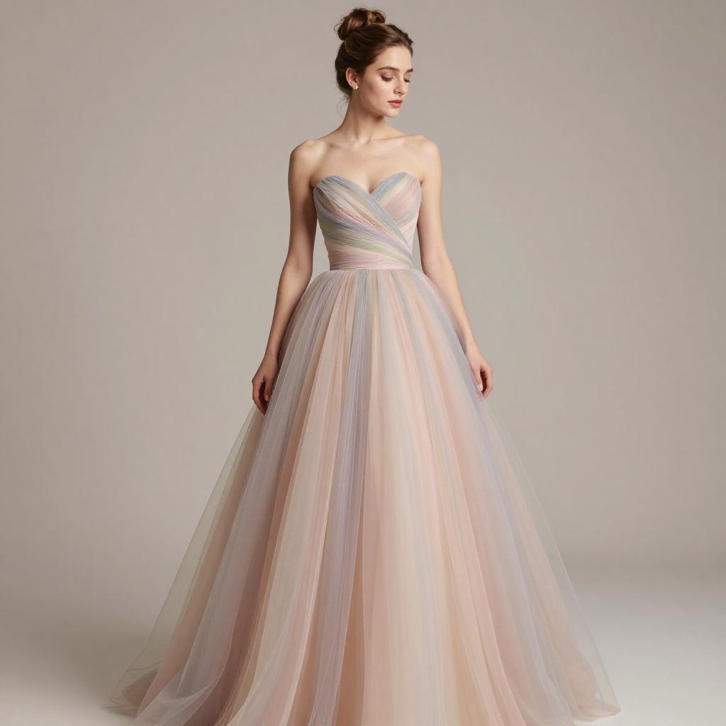 Portrait of a graceful woman with an elegant chignon hairstyle wearing a strapless pastel ball gown featuring a fitted bodice and full skirt. The background consists of a dreamy pastel blend studio setting, enhancing the upscale fashion look. The model exudes a refined and aristocratic presence.