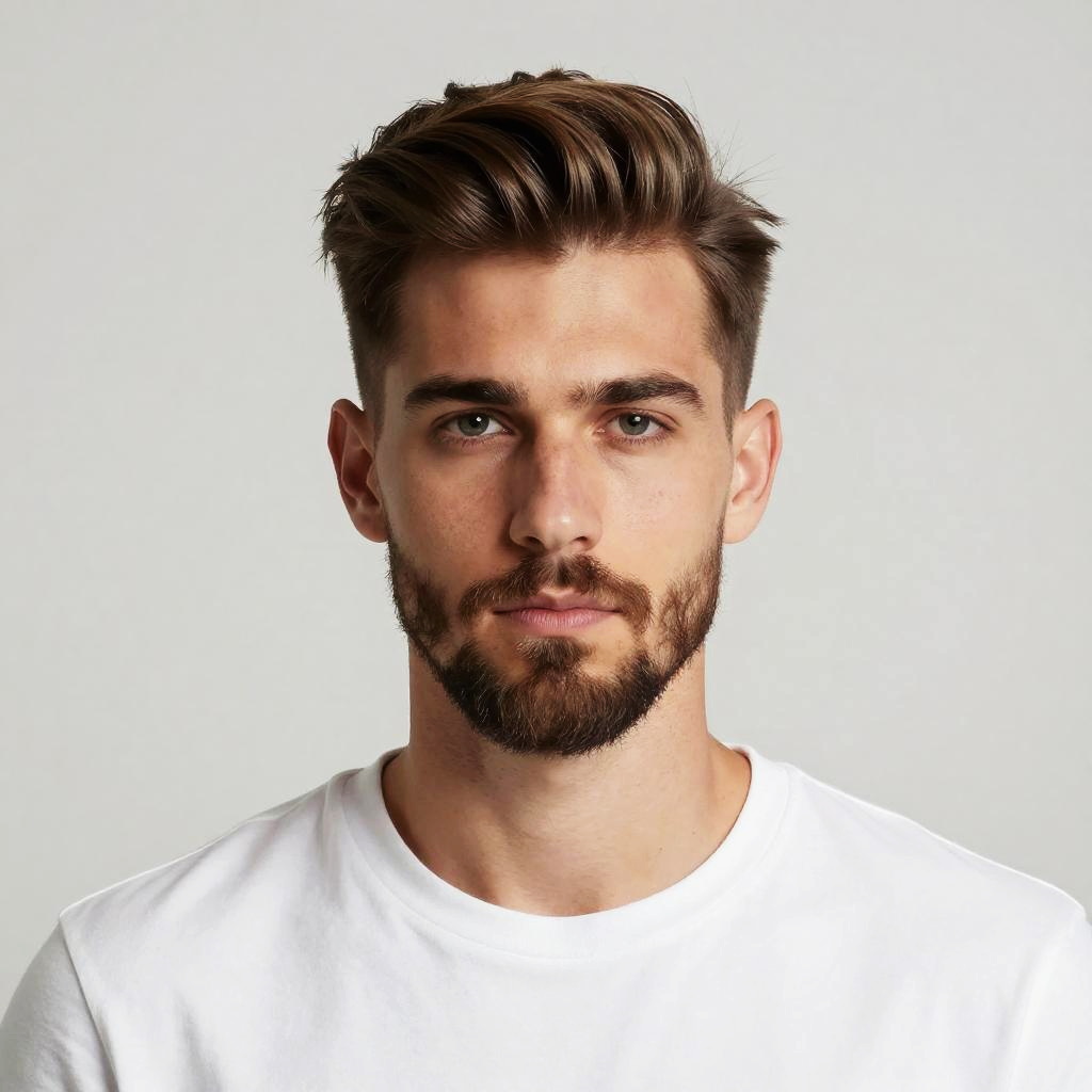 A medium length goatee styled precisely on a young man, sleek haircut, minimalist background, professional lighting, hyper-realistic digital portrait