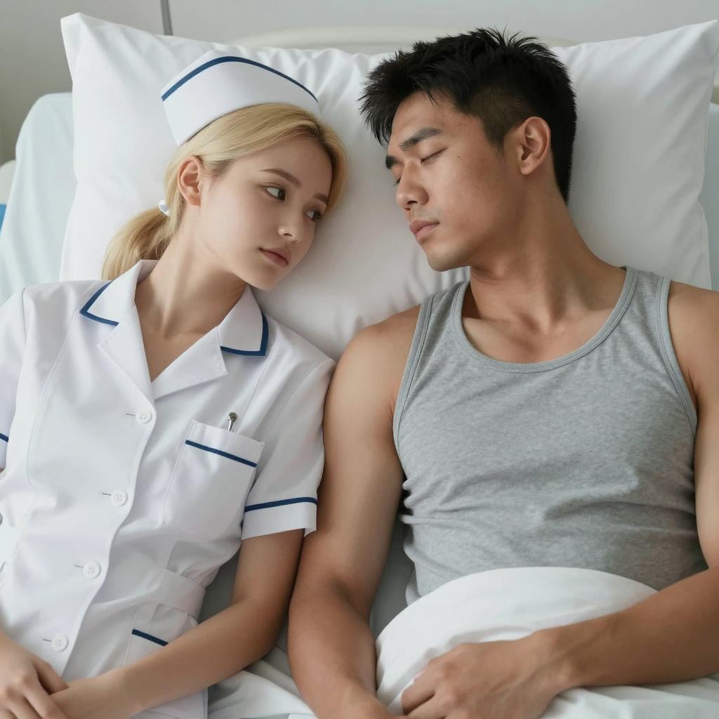 A blonde female nurse in a white uniform with blue trim lies beside a muscular Asian male patient wearing a gray tank top on a hospital bed. The man has his eyes closed while the nurse looks at him with a neutral expression. Both are resting on white pillows in a clinical setting.