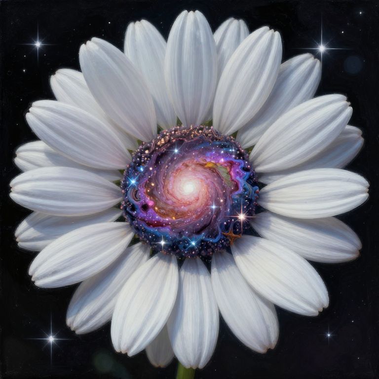 Digital artwork of a white daisy with elongated petals radiating from a vibrant, galaxy-like center. The flower's core is a swirling mix of pink, purple, and blue, resembling a nebula, dotted with sparkling stars. The white petals have a smooth, slightly textured appearance. The background is a deep black, accentuating the bright, celestial center of the flower. The overall style is hyper-realistic with a fantastical twist, blending natural and cosmic elements.