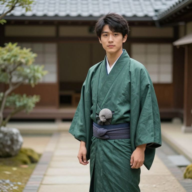 Tatsumaki, asian boy in green kimono standing in a courtyard