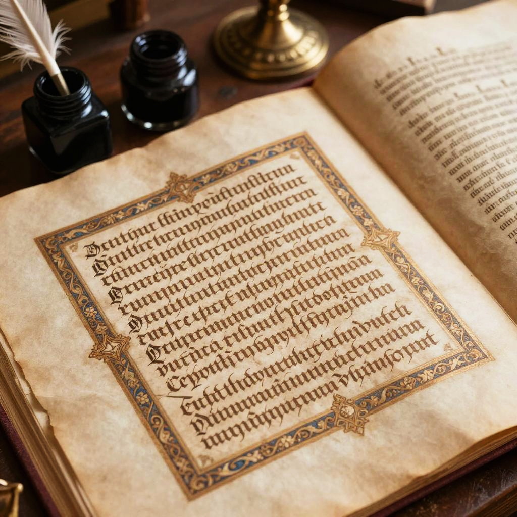 Iberian Peninsula language calligraphy displayed on parchment, ornate medieval book setting with ink pots and quills, soft natural lighting and detailed textures, historical atmosphere