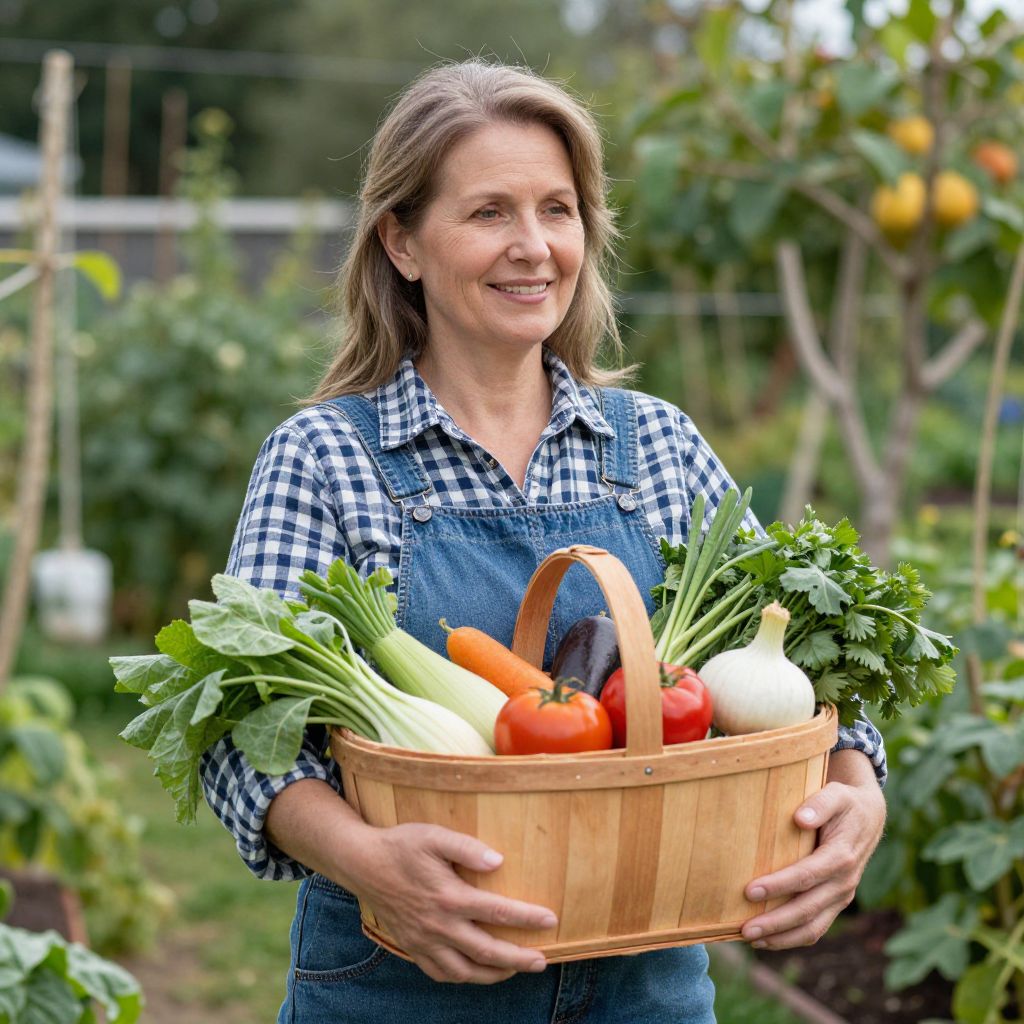 Amidst the vibrant embrace of a lush garden, a mature woman cradles a wooden basket brimming with freshly harvested vegetables, embodying the serene joy of connection to nature and the enduring rhythm of life's cycles.