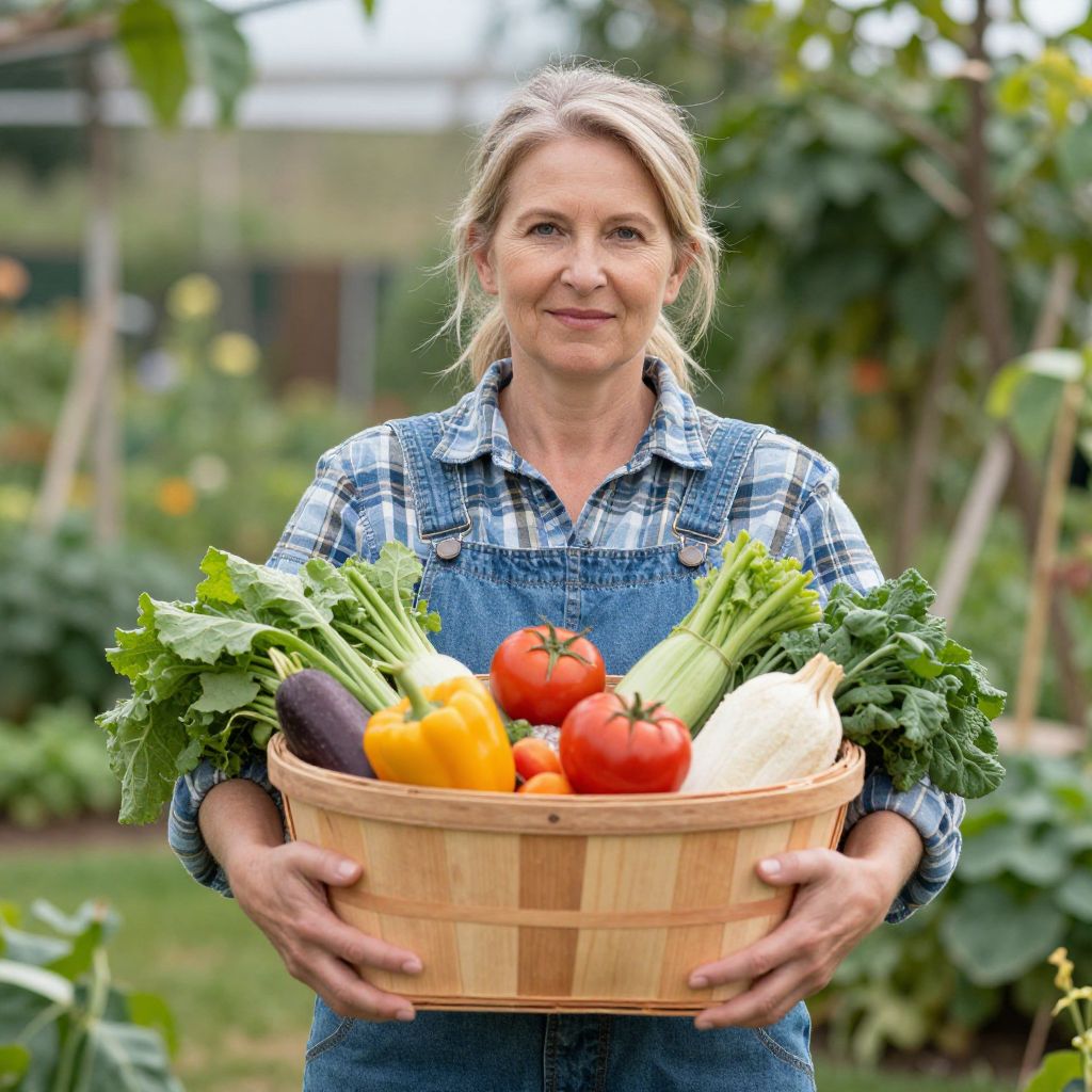 Photograph of a middle-aged white woman with blonde hair in a blue denim shirt, standing in a lush vegetable garden. She holds a wooden basket filled with an assortment of fresh vegetables, including zucchinis, eggplants, tomatoes, carrots, and leafy greens. She smiles gently at the camera. The background features blurred garden plants and a wooden fence. The image has vibrant colors and a natural, outdoor setting, emphasizing a sense of community gardening and fresh, homegrown produce.