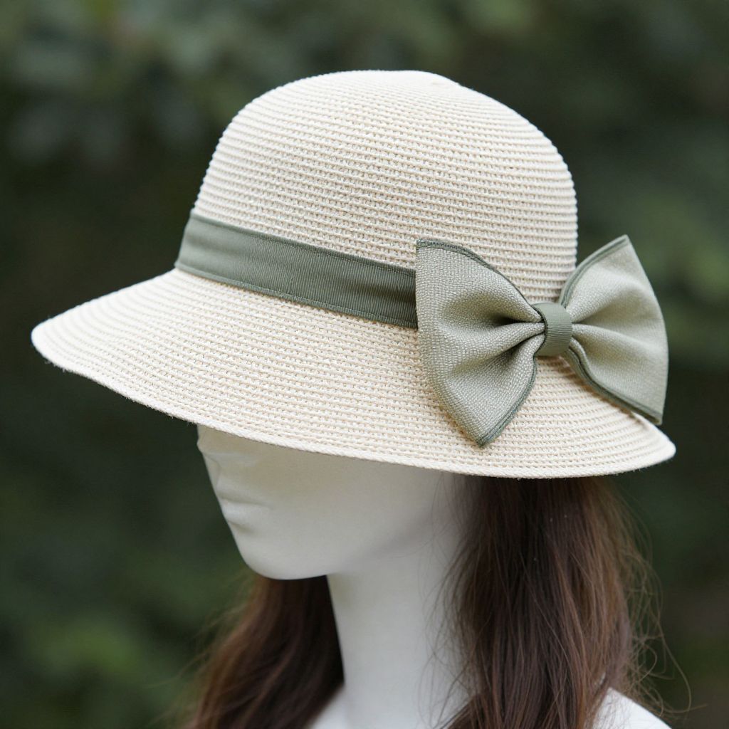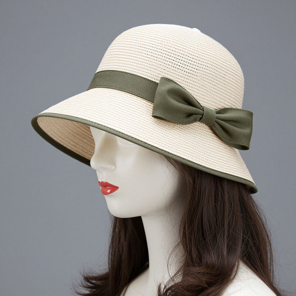Photograph of a white mannequin head wearing a wide-brimmed, cream-colored straw hat with a dark green ribbon and bow. The mannequin has dark brown, wavy hair, red lipstick, and no other facial features. The background is a solid, medium gray. The hat's texture appears woven, and the ribbon is smooth. The mannequin is positioned with its face slightly turned to the left, showcasing the hat's side profile.