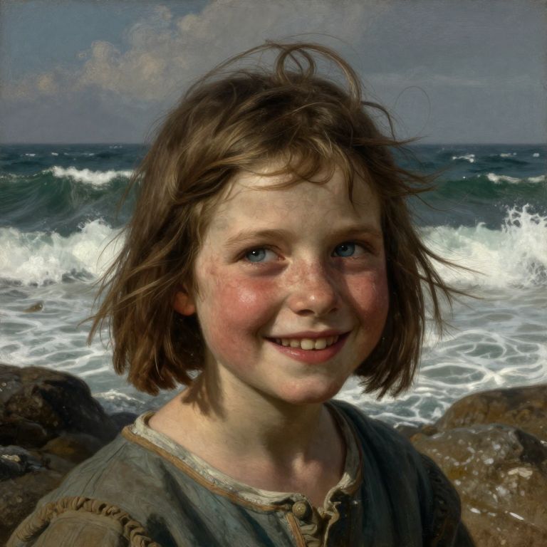 Craft a photorealistic portrait reminiscent of Rembrandt's chiaroscuro technique, focusing on a close-up of a weathered yet joyful girl with kind blue eyes. Position her against turbulent ocean waves crashing onto a rocky shore. The intricate play of light and shadow across her rugged features accentuates the lines that years at sea have etched upon her face, while the glint in her eye conveys both wisdom and a forgotten dream. Capture this scene, emphasizing her expression and surroundings to convey resilience and longing, reflecting the soul adrift amidst life's vast, unforgiving expanse.