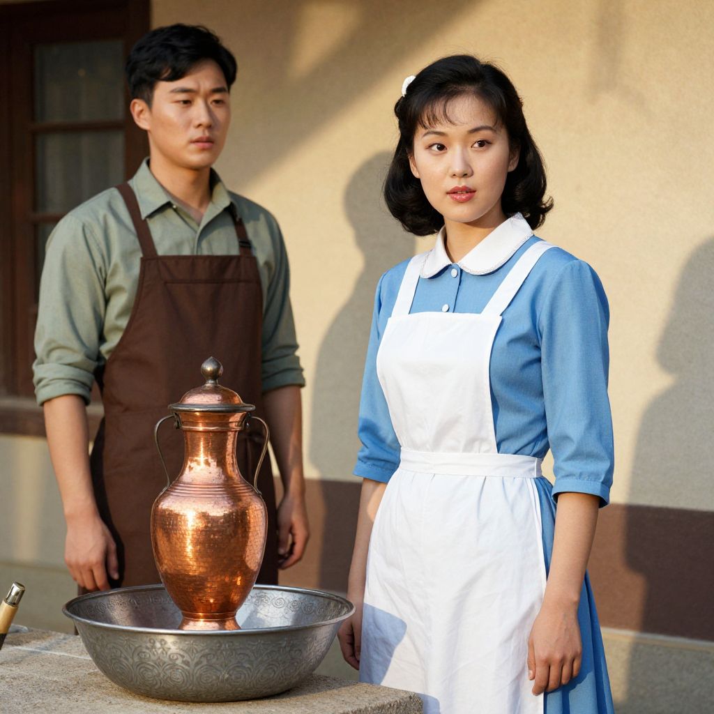 Photograph of an Asian woman with short black hair wearing a white apron over a blue dress, standing in front of a man with black hair in a green shirt and brown apron. They are outdoors against a beige wall with a window. A copper jug with a lid sits in a metal bowl on a concrete surface in the foreground. The woman looks directly at the camera, while the man stands slightly behind her, looking to the side. The lighting casts soft shadows, highlighting their faces and clothing.