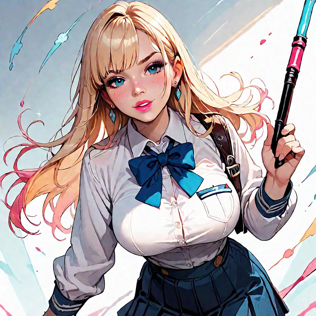Score_9, score_8_up, score_7_up, source_anime, 1girl, bangs, blonde hair, blush, breasts, earrings, holding weapon, large breasts, long hair, looking at viewer, multicolored hair, open mouth, parted lips, school uniform, smile, standing, thick thighs