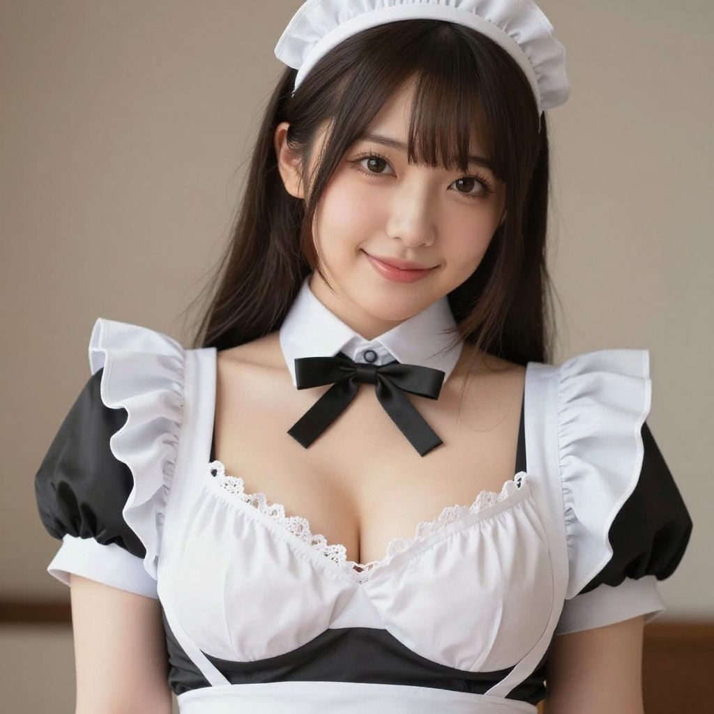 Anime-style digital drawing of a smiling, attractive young woman in a black and white maid outfit with frilled apron and headpiece, emphasizing her large