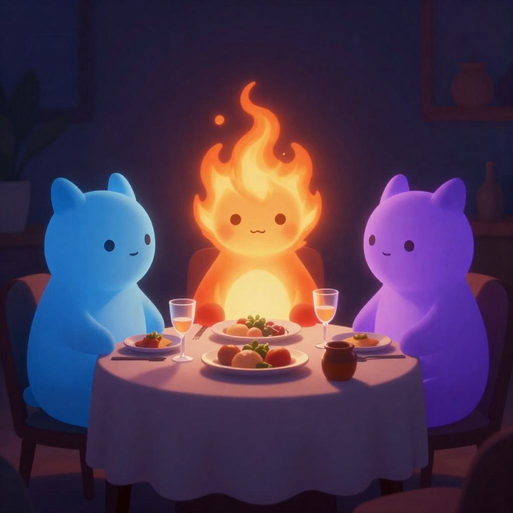 A digital illustration of three glowing, anthropomorphic creatures with blue, purple, and fiery orange hues, dining in a dimly lit room. The central figure with a fiery head sits between two blue and purple creatures, surrounded by illuminated dishes, glasses, and a jar. The background features dark, abstract shapes.