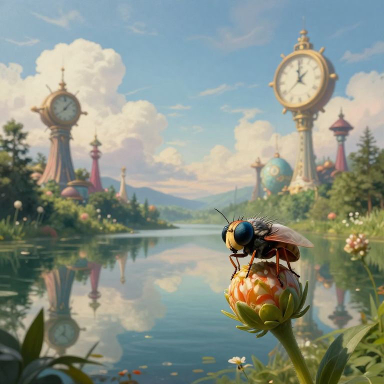 An enchanting landscape painted in a surrealistic style, featuring an idyllic lake mirroring an otherworldly sky adorned with timepiece anomalies and fantastical architectural forms. This unique perspective, akin to witnessing the scene through the compound eyes of a tiny insect resting on a flower bud, simultaneously stirs feelings of awe and unease. The harmonious blend of dreamlike elements with nature's beauty creates a captivating emotional spectrum that beckons viewers into this mesmerizing realm of fantasy.