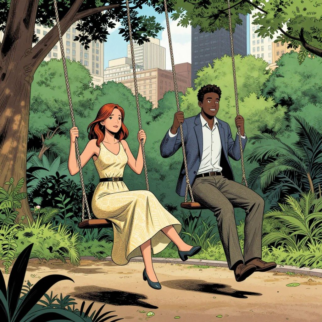 Graphic novel style illustration of a young woman with red hair in a yellow dress and a young Black man wearing a blue blazer and brown pants swinging side-by-side on rope swings in a lush green city park. Skyscrapers are visible in the background behind dense trees and foliage, with sunlight filtering through the tall trees above, highlighting natural movement and vibrant colors.