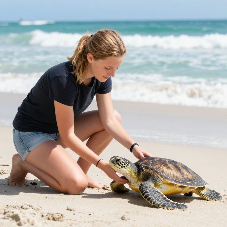 Photograph of a blonde woman in a black shirt and denim shorts kneeling on a sunny beach, gently touching a sea turtle with greenish-yellow shell.