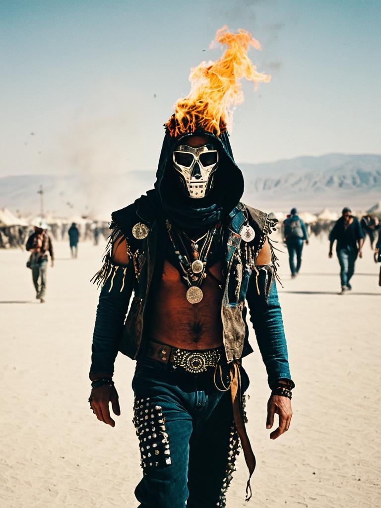 Man in Burning Man outfit, cinematic realism, desert fashion photo