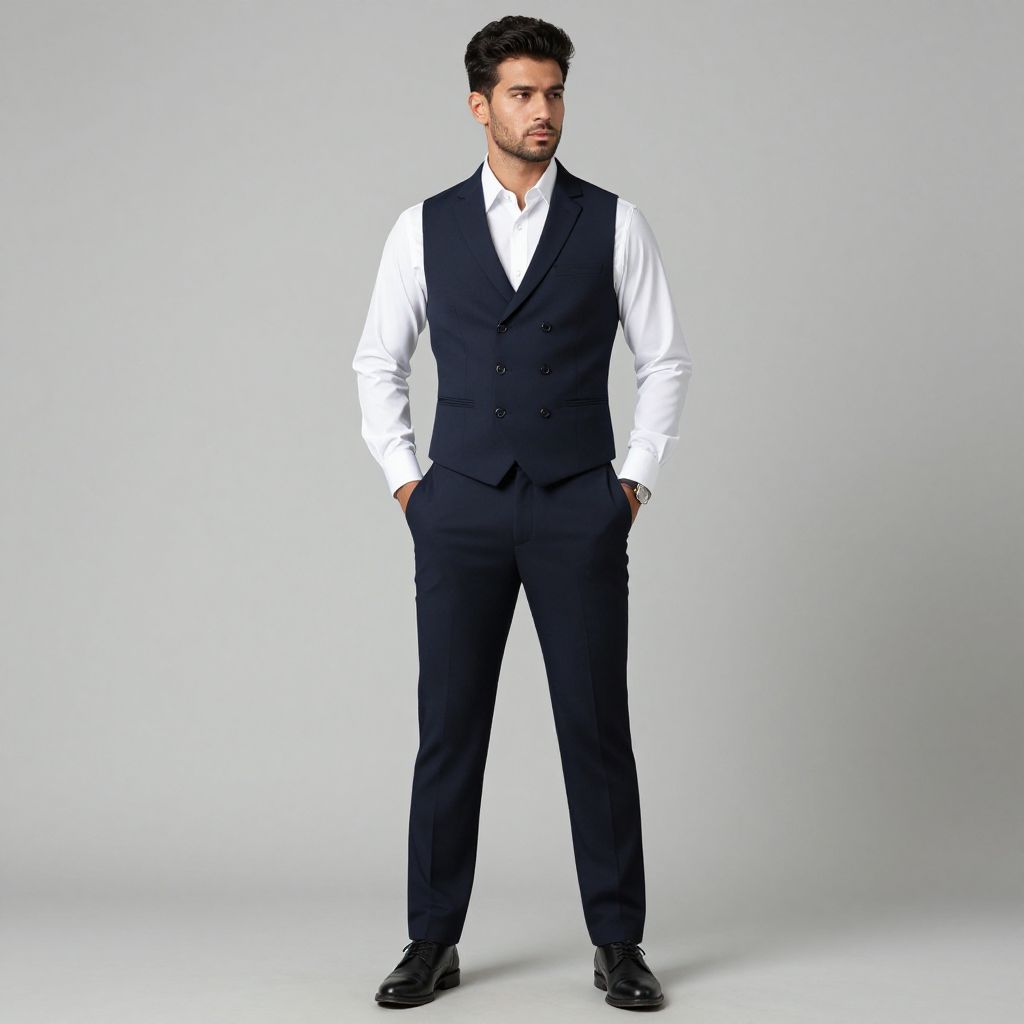 Waistcoat stylish costume, 1boy, male focus, solo, vest, hands in pockets, black hair, pants, full body, realistic, standing, shirt, shoes, facial hair