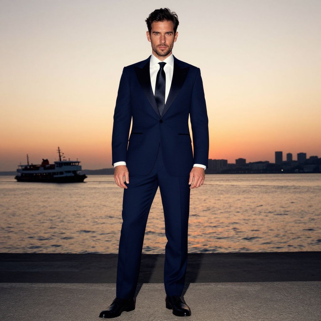 A man, midnight blue tuxedo, shawl collar, ivory dress shirt, black silk tie, black leather derby shoes, sunset glow on water, silhouettes of ferries, distant city skyline, lomography analog photo, confident expression. Man has masculine face and piercing eyes