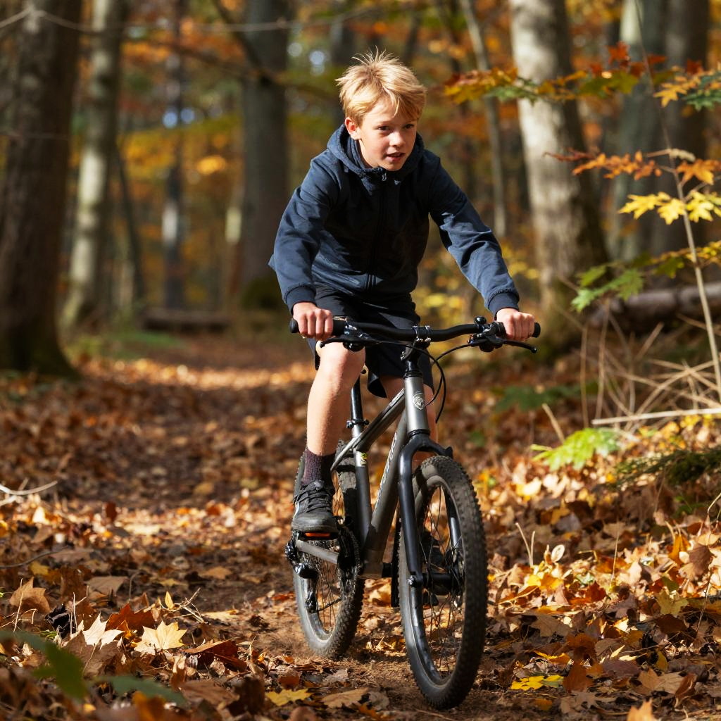 A photograph of a young boy with light skin and blue eyes, wearing an orange climbing helmet and black shirt with orange pants. He's smiling and holding a black rope with both hands. He has a blue and red climbing harness and a green wristband. The background is blurred with green foliage and a wooden structure. The image has a vibrant, colorful feel.