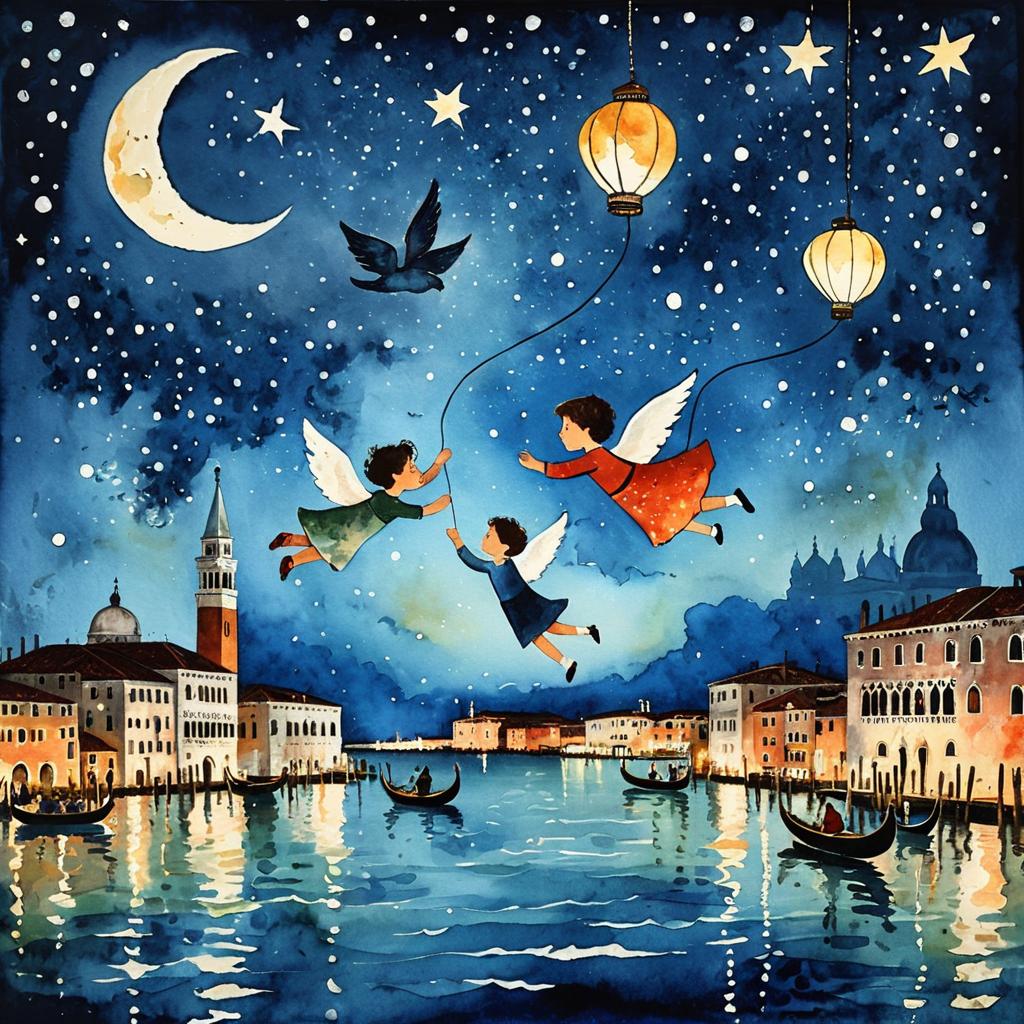 Watercolor Painting in playful primitive surrealist Marc Chagall style, three children soaring on lanterns across the starlit bay, above Venice, whimsical, dreamy atmosphere, soft glowing lights, enchanting night sky, infused with magic and love, angels, winged cats