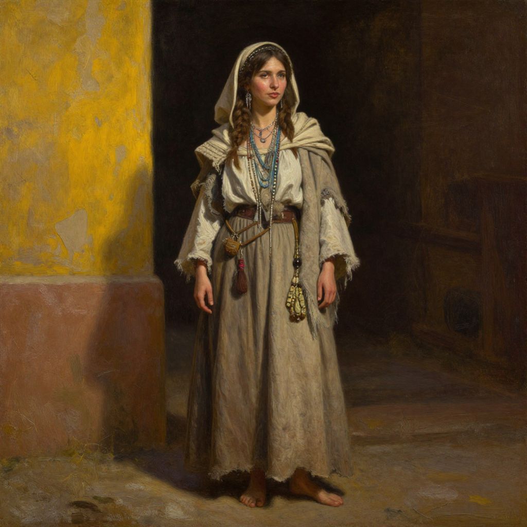 Photograph-style painting of a young woman in traditional Middle Eastern attire, including a beige hooded robe, layered necklaces, and bare feet, standing