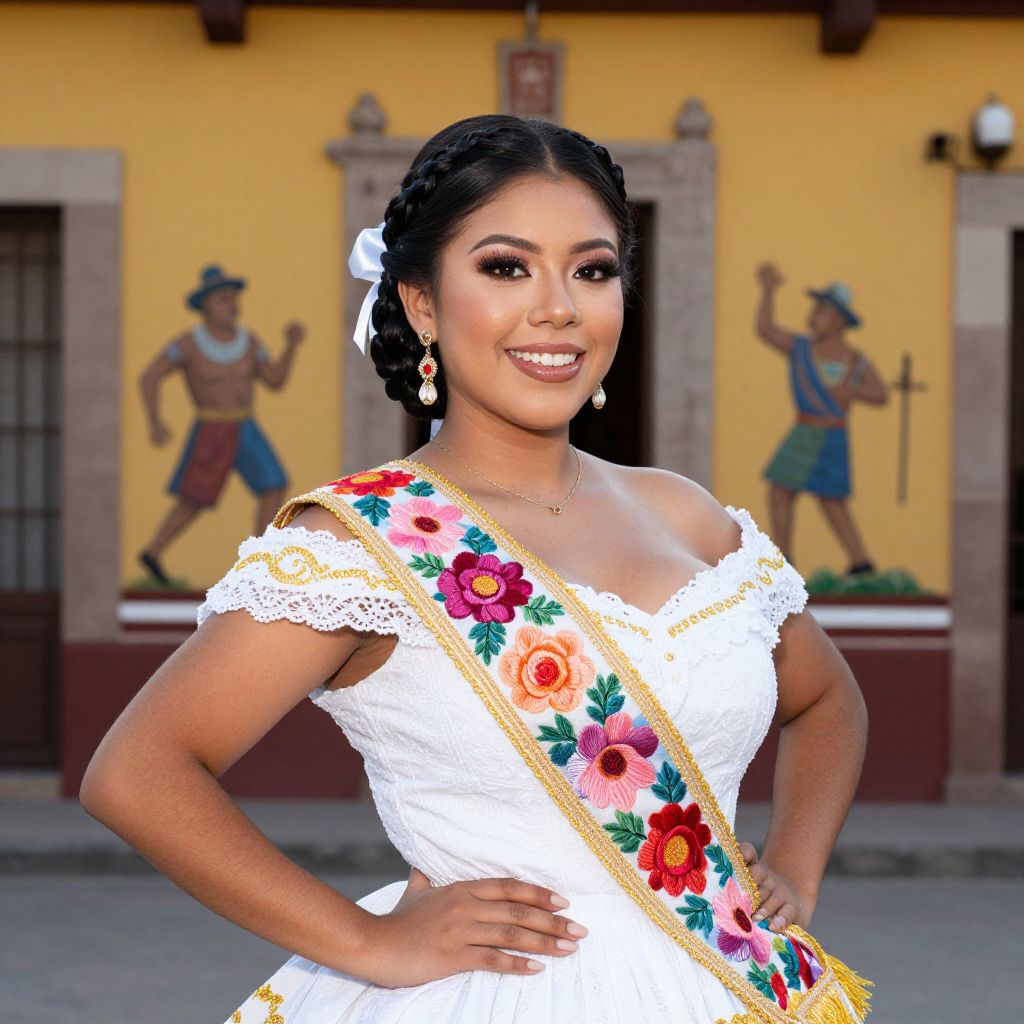 Photographed in a traditional Mexican cultural setting, a lovely young woman with caramel skin, full lips, and dark brown eyes stands in front of a mural-covered building, wearing a full quinceanera costume with a floral sash and a formal updo with a satin ribbon and intricate braids, smiling with pride during a family celebration.. The woman has big tits and cute face