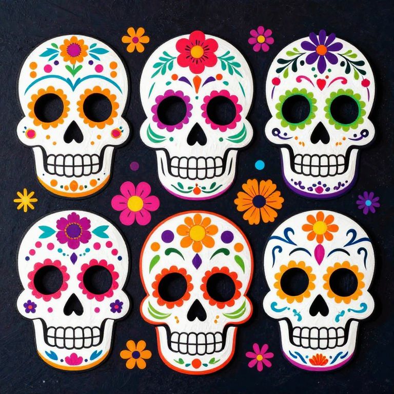 Vibrant sugar skull artwork featuring five intricately decorated skulls surrounded by colorful floral patterns, set against a dark background, evoking the festive spirit of Day of the Dead celebrations.