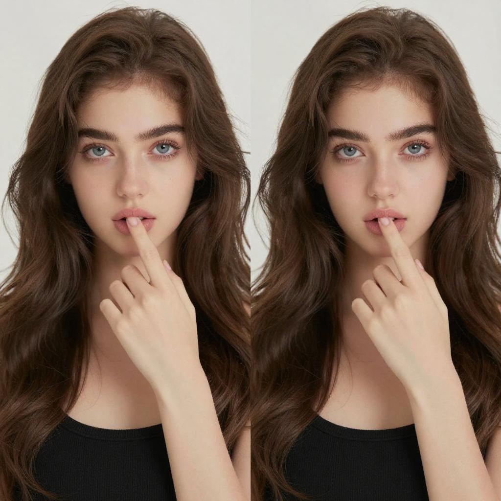 Photograph of a young woman with long brown hair, light skin, and blue eyes, wearing a black sports bra and black pants. She is leaning forward, holding a crumpled, golden-brown pastry in her right hand, smiling slightly. The background features a white couch, a gray patterned rug, and a modern, white-tiled room with black bags and a tripod.