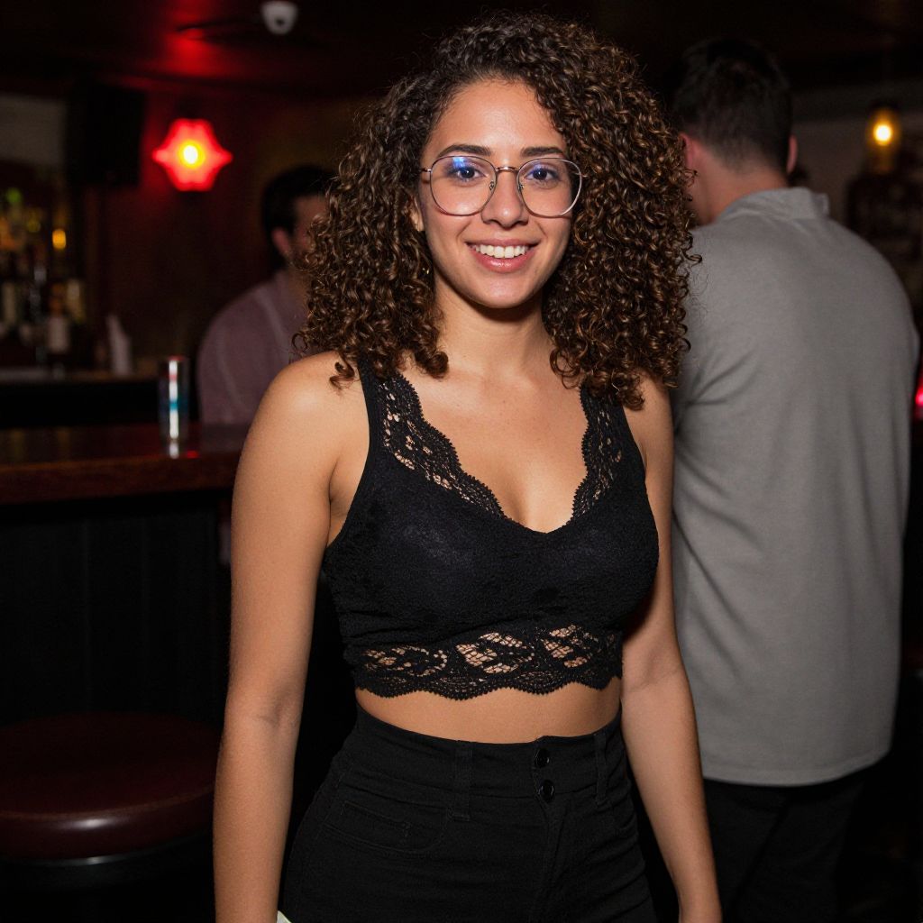 Photograph of a smiling woman with curly brown hair and glasses, standing in a dimly lit bar. She's wearing a black lace crop top that reveals her midriff and high-waisted black pants. Her skin is light brown, and she has a slim build. In the background, a man in a gray shirt is partially visible, along with red and yellow lights. The atmosphere is casual and slightly mysterious.