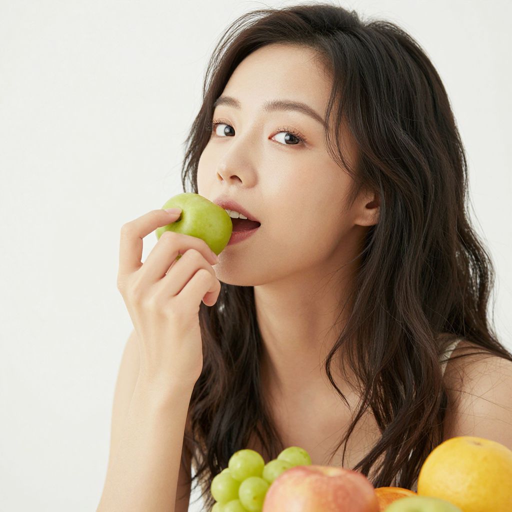 Photograph of an Asian woman with fair skin and long black hair, partially tied back. She is biting into a green apple, holding it with her right hand close to her mouth. She has small, natural eyebrows, black eyes, and is wearing a white, V-neck shirt. The background is entirely white, creating a clean, minimalist look that focuses attention on the woman and the apple. Her expression is neutral, with a slight hint of enjoyment. The image has a bright, even lighting that highlights her smooth skin and the apple's fresh texture.