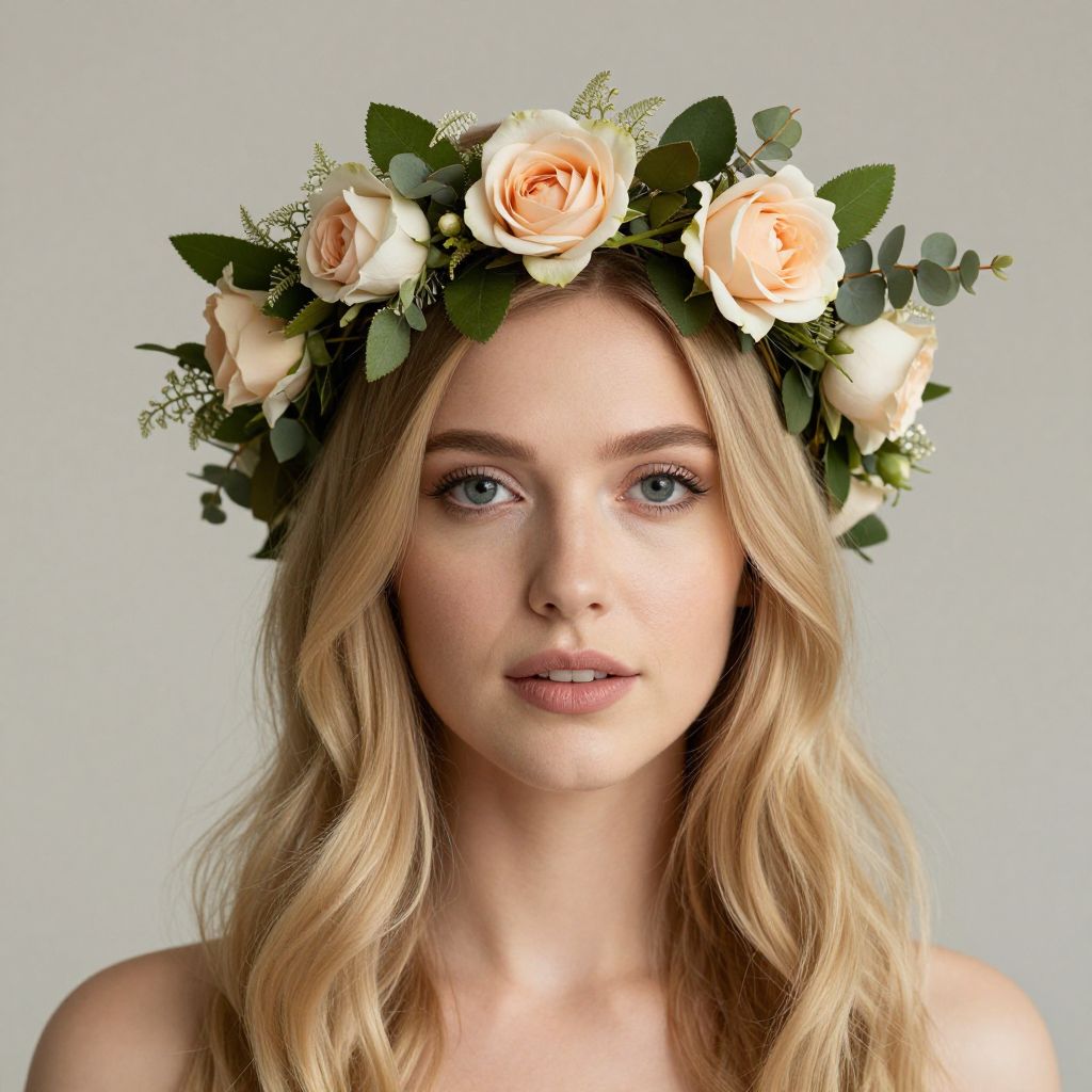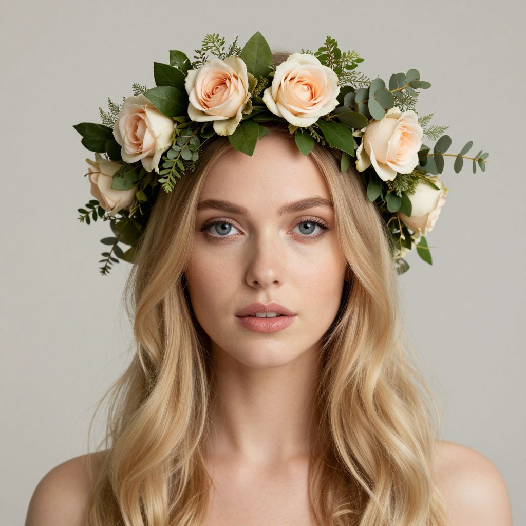 Blonde woman wearing a delicate leafy crown adorned with soft blush and cream roses, complemented by lush green foliage and eucalyptus sprigs, exudes a subtle yet elegant charm against a neutral backdrop.