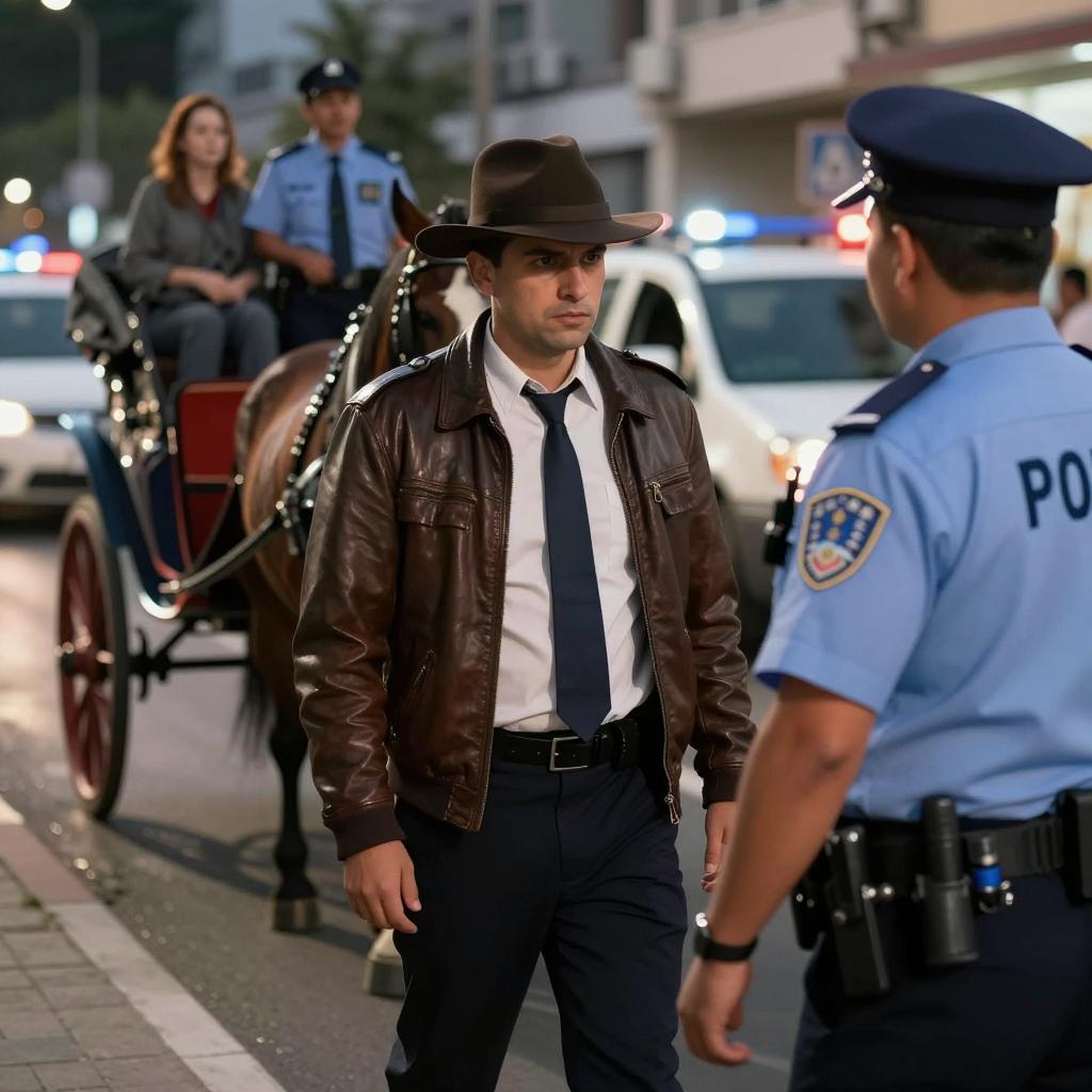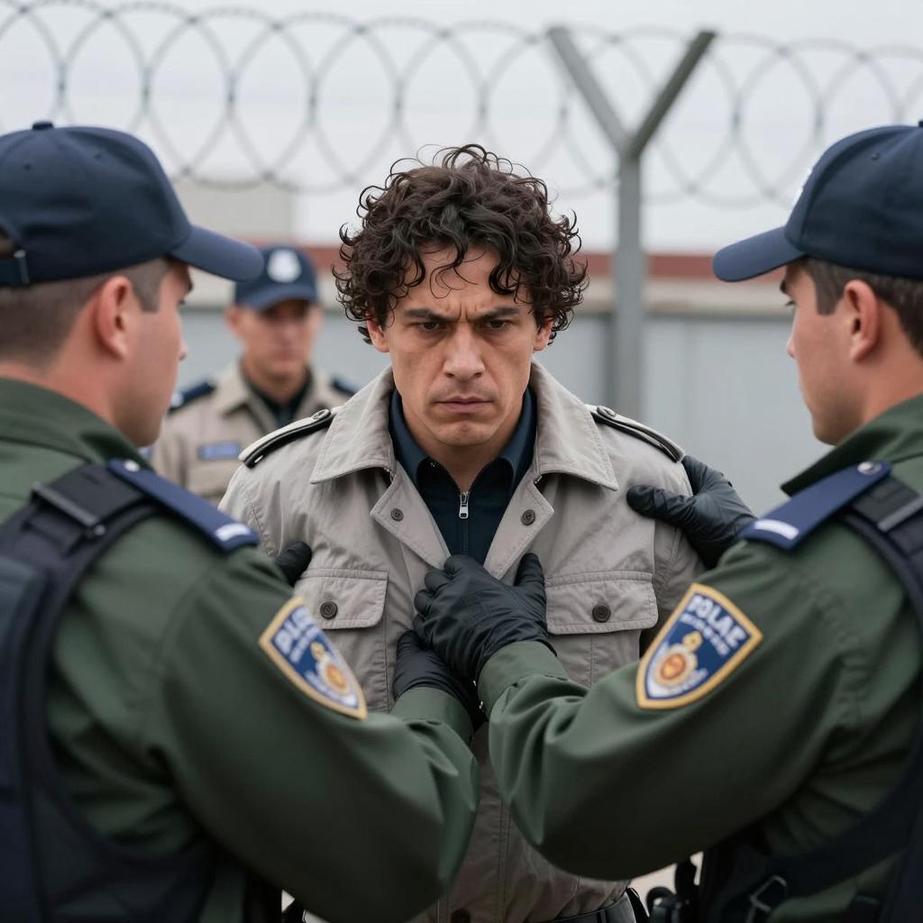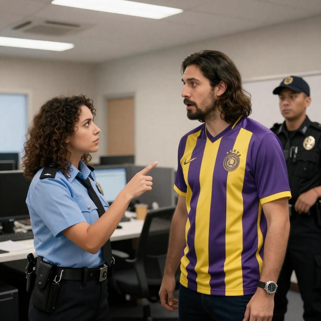 Photograph of a man with long dark hair and a mustache wearing a blue and yellow striped soccer jersey, standing beside a female police officer with curly hair, light blue uniform, and black tie. Background shows three other police officers. Female officer points at man's chest. Indoor setting with fluorescent lights and wooden paneling. Man looks serious, officer looks focused.