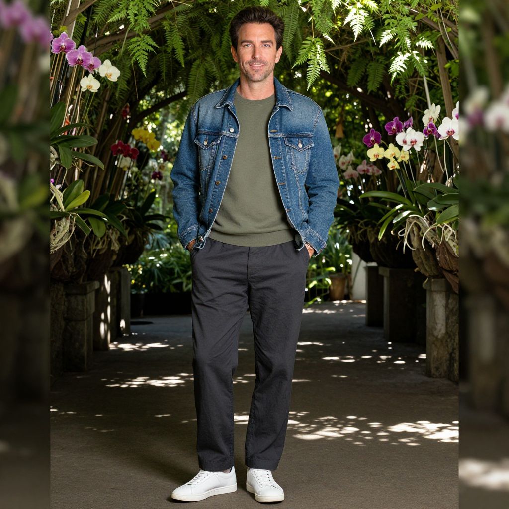 A man, charcoal relaxed fit trousers, olive green cotton crew neck sweater, white leather sneakers, denim jacket, standing under a lush green canopy, vibrant orchids, dappled sunlight filtering through, camera obscura style, relaxed pose with hands in pockets, soft smile.Man has masculine face and piercing eyes