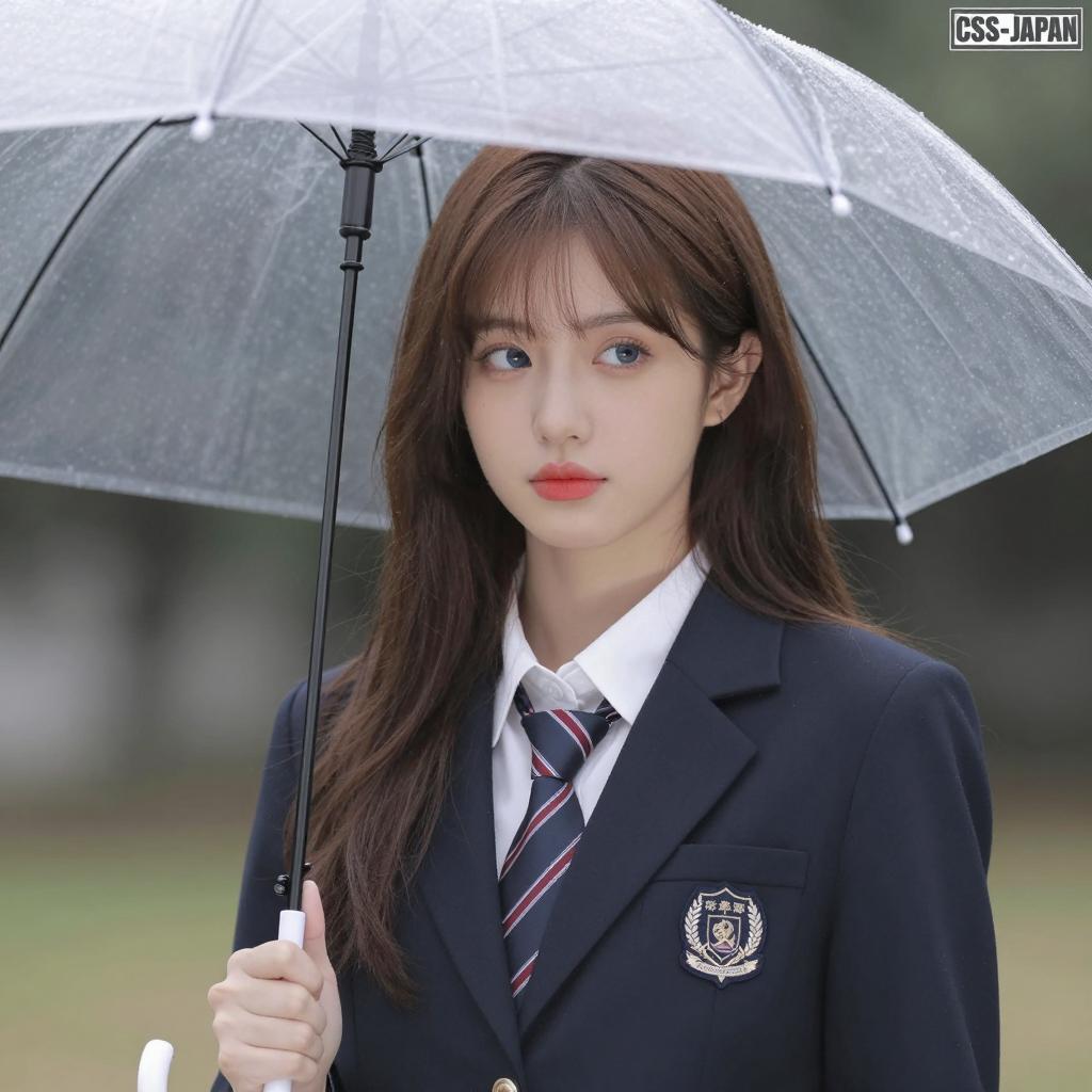 Young woman with long brown hair holding a transparent umbrella, wearing a navy blue school uniform with a white shirt and striped tie, and a school crest on her left chest. She has light skin, blue eyes, and red lipstick. She is looking slightly to the right with a neutral expression. Background is blurred. Watermark "CSS-JAPAN" in top right corner.
