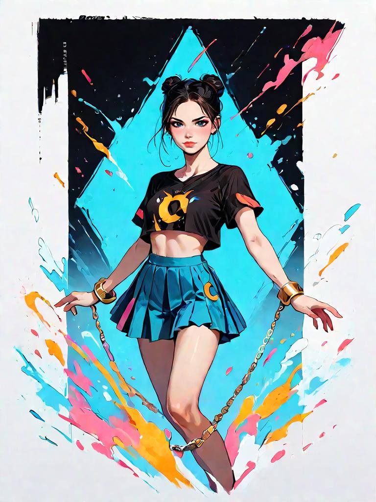 Full body digital illustration of a young woman with a realistic face and contemporary fashion. She wears a black crop top with a keyhole cutout and asymmetrical neckline, paired with a high-waisted pleated skater skirt in blue. The woman has dark hair styled in double buns and accessorizes with gold chain bracelets. The background features vibrant splashes of pink, orange, and blue paint against a studio white backdrop.