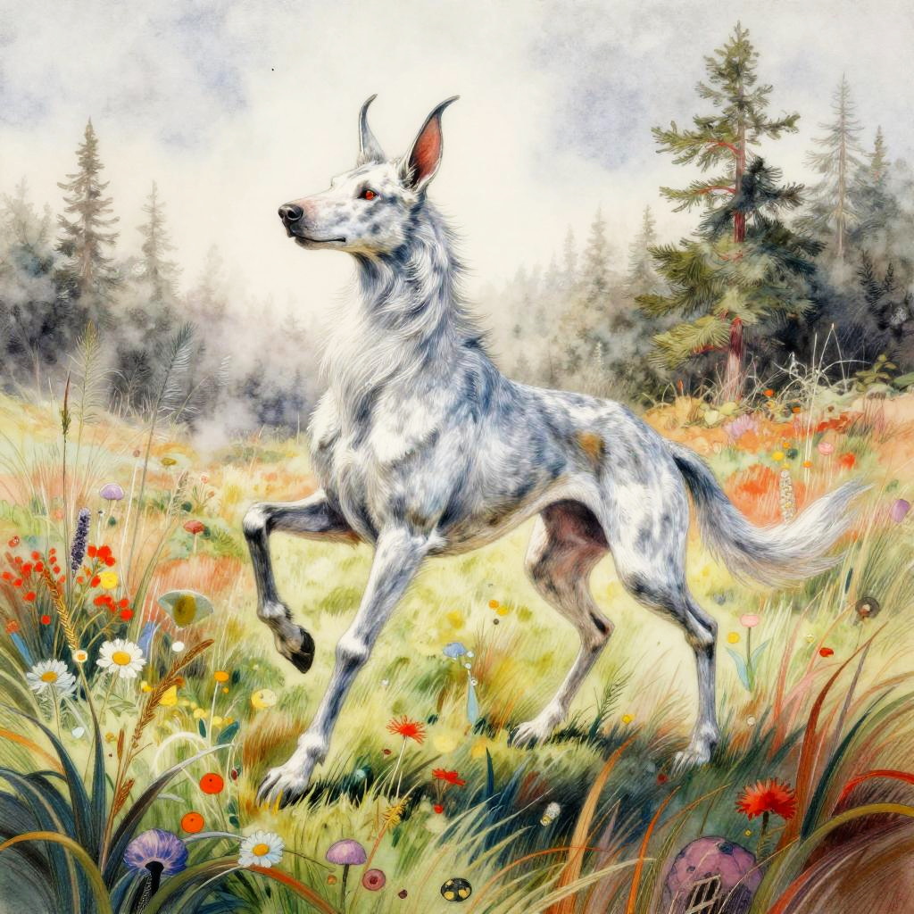 A dancing silver kelpie, legendary and magical, set in misty moorlands, inspired by Mary Blair, Howard Pyle, Artgerm, vibrant colors, highly detailed with watercolored pencil texture.