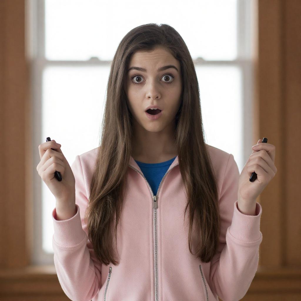 Photograph of a young woman with long, dark brown hair and wide, surprised eyes. She wears a pink zip-up jacket over a blue shirt, holding a black object in each hand. Bright light from a window behind her creates a glowing effect. She stands in a wooden room, looking directly at the camera.