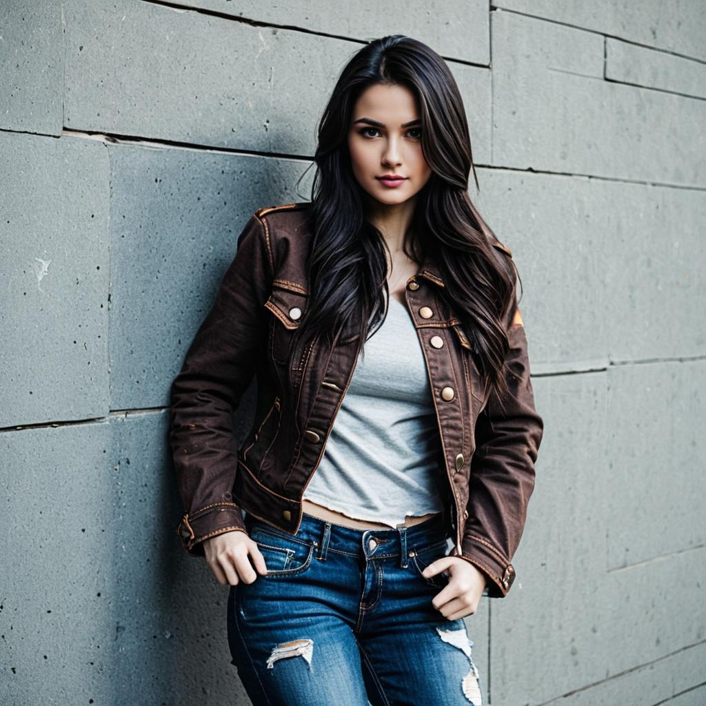 Portrait of a young woman with long dark loose hair wearing a brown fitted denim jacket over a red top and ripped blue jeans, standing against a grey concrete wall with small holes.