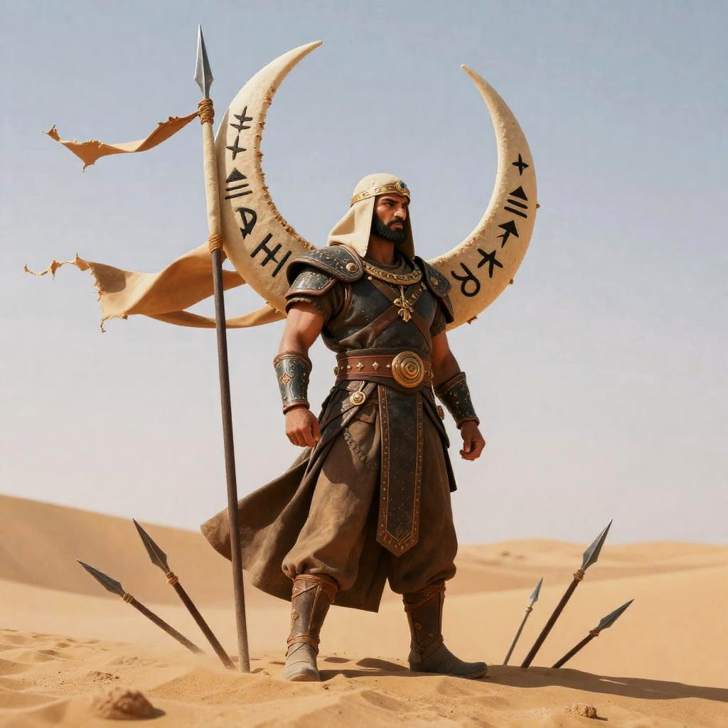 A desert nomad warlord stands confidently atop a dune of broken spears, with a sand-torn crescent standard embroidered with tribal runes billowing behind him. This unyielding figure embodies strength in a dramatic fantasy setting, showcasing intricate details and merging modern digital artistry with classic influences.