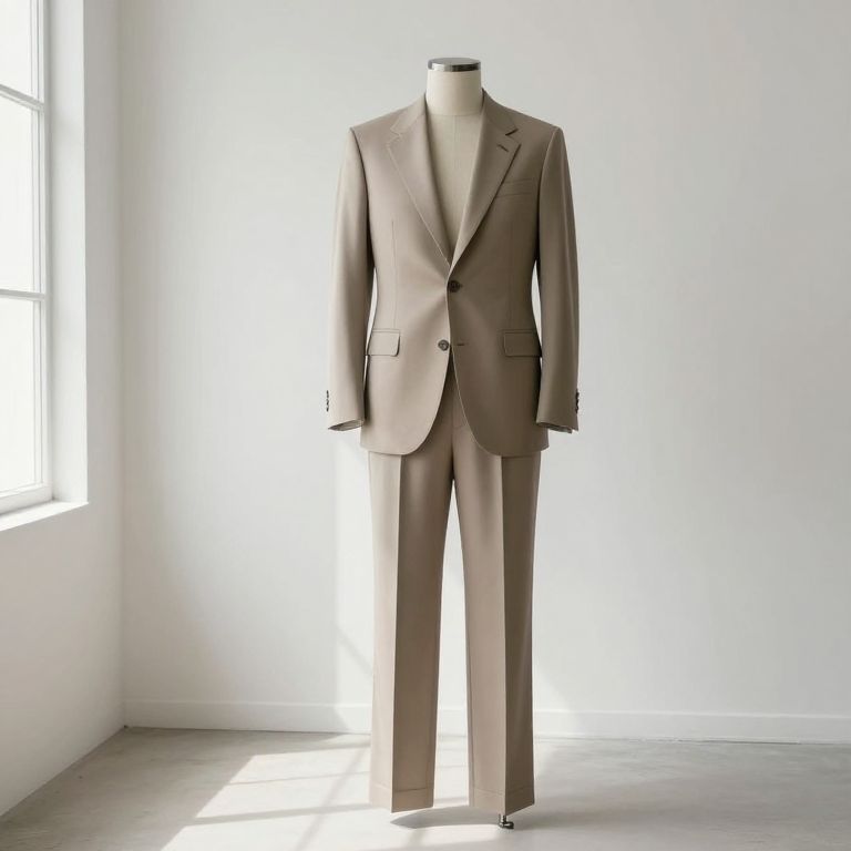 A mannequin standing in front of a large window, wearing a well-fitted brown suit with a black vest and a black fedora hat, adorned with a crisp bow tie. The mannequin is posed upright and still, facing outward with a neutral expression. Outside the window, a serene landscape of tall trees with soft green foliage stretches into the distance, bathed in natural daylight. On either side of the mannequin, two potted plants—one with lush green leaves and the other with blooming flowers—stand neatly arranged, adding a touch of organic life to the otherwise stylized scene. The setting is clean, modern, and slightly nostalgic, blending mannequin fashion with a natural outdoor backdrop.