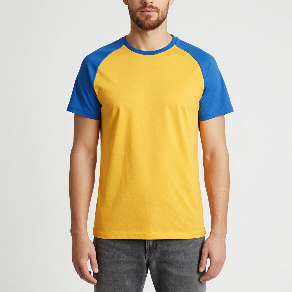 Man with short hair and beard wearing a yellow and blue t-shirt and grey jeans.